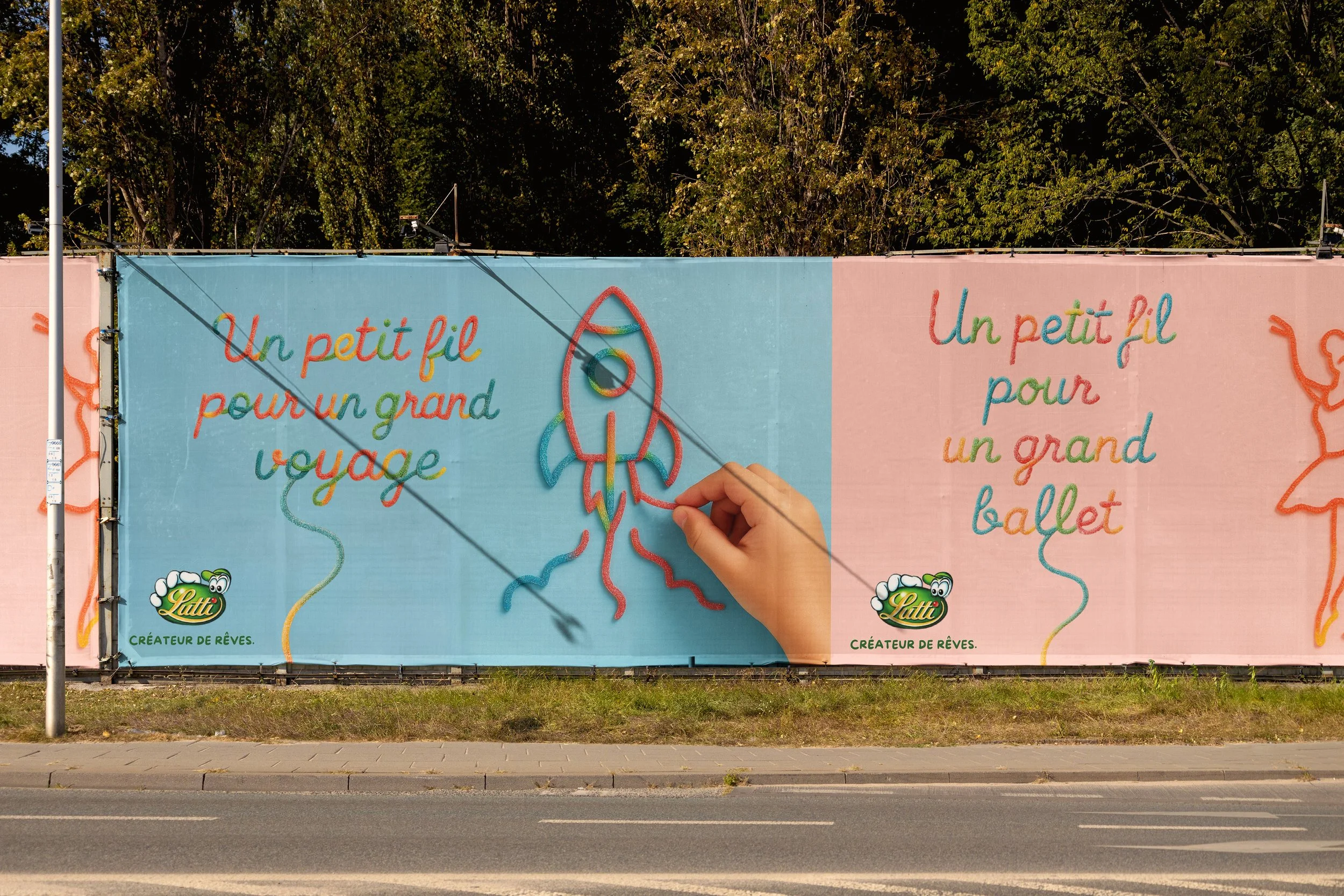 Cette campagne conceptuelle imagine Lutti comme un acteur de l’imaginaire, capable d’inspirer les plus jeunes à rêver, imaginer, construire. Le slogan central, « Un petit fil pour un grand... », devient le point de départ de chaque visuel, jouant sur la forme longue et colorée des bonbons soucettes fil, utilisés ici comme un outil de dessin.